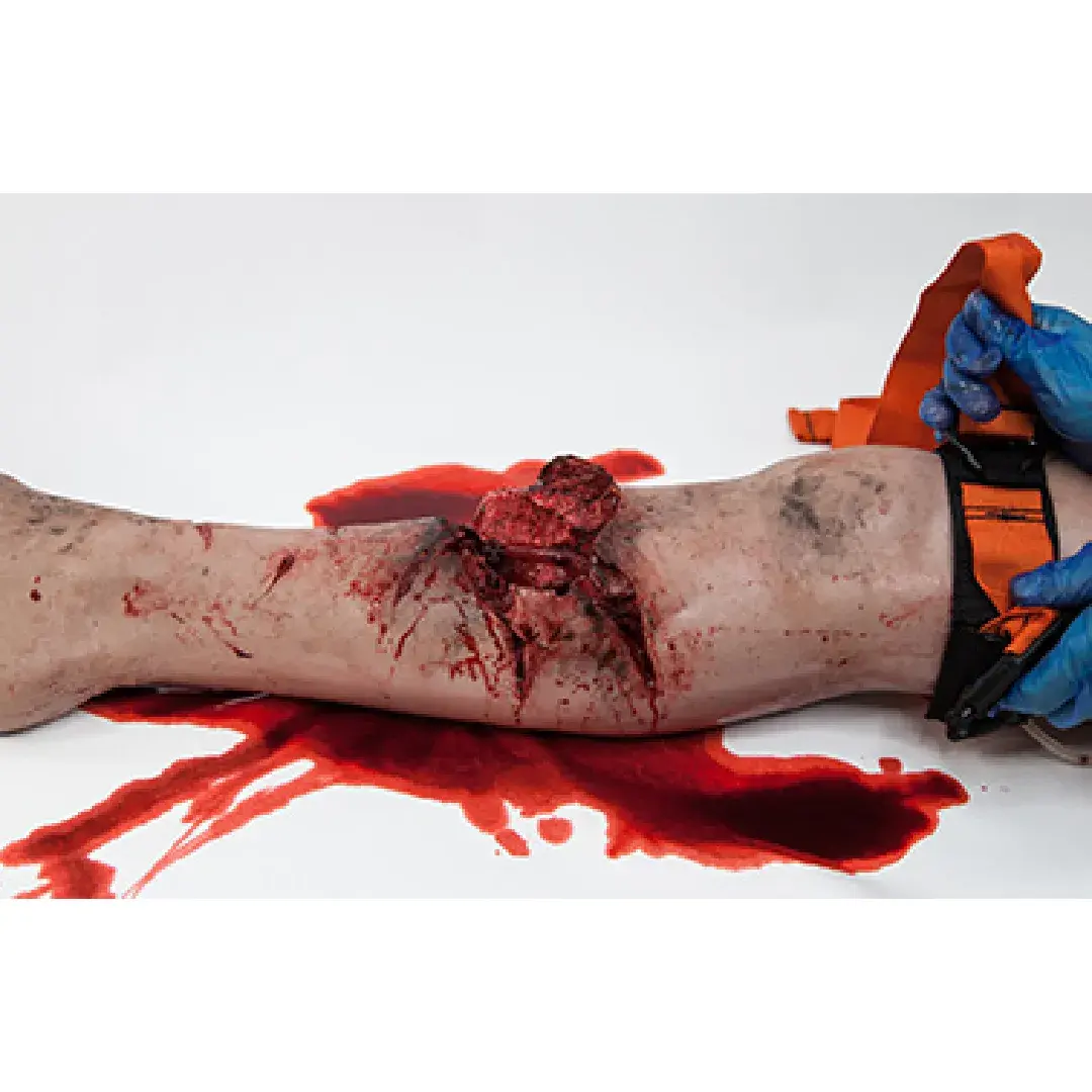 This simulator features a built-in major injury to the lower leg, exposing internal bone and muscle. With integrated bleeding tubes designed to provide realistic hemorrhagic bleeding using a hand pump, it allows students to practice hemorrhage control using tourniquets, bandages, and hemostatic agents.